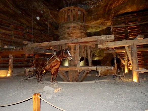 These horses operated a machine that moved the salt logs from one level to another. There are nine levels and 2 km of shafts and tunnels but we only visit about 1% of the mine.