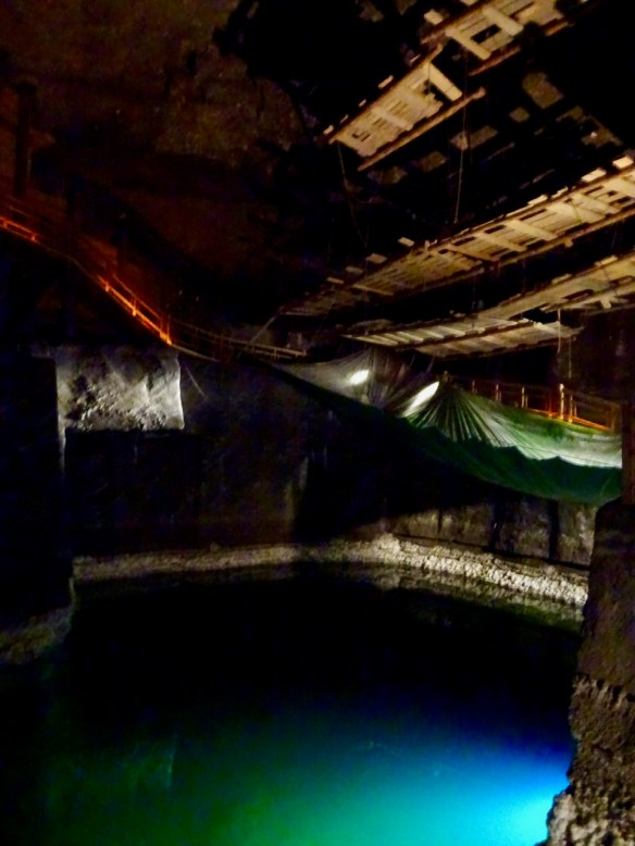 The Wieliczka Salt Mining Tour is on the agenda for today. It is a twenty minute drive and we arrive early so we sit in a nearby park where it is cooler until it is time for our tour. It is going to be 31° today, so going into a mine where the temperature is a constant 17° seems like a good idea. Immediately upon entering the mine we descend 54 flights of stairs, 380 steps down to the first level of the mine which is 64 meters deep. This photo is looking down the crack between the flights of stairs…and we were already almost halfway down when I took this!