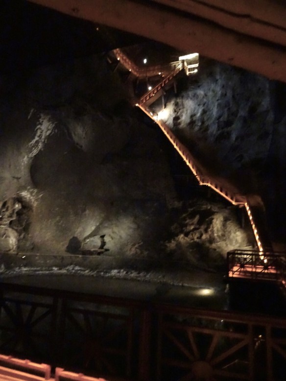 Another underground brine lake. The water in these lakes is 33% salt. Ocean water is only 3% salt. Luckily we do not climb this set of stairs! They disappear in to the darkness at the top of this chamber.