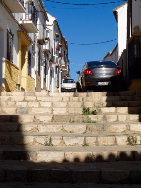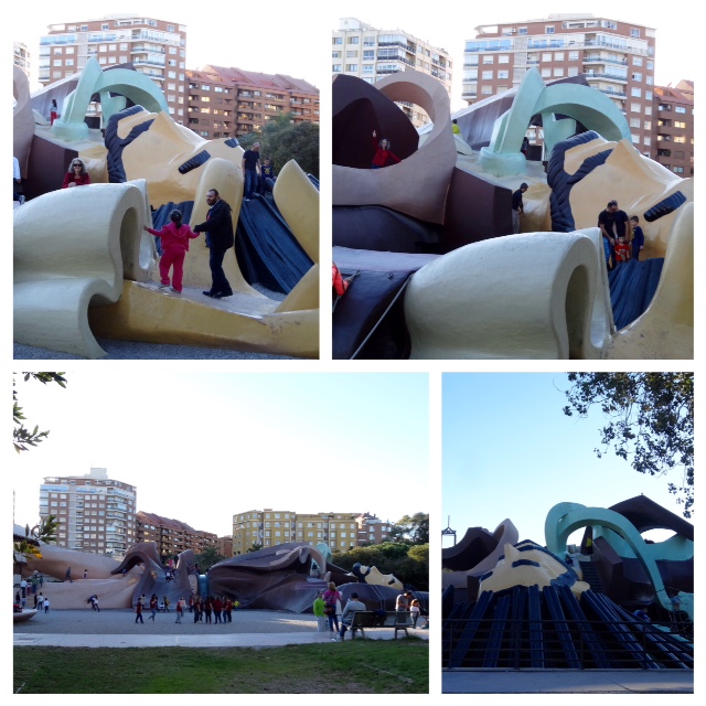 Our walk from the metro to the park is all uphill! Luckily there are escalators for the very steepest part of the climb. I liked the imagery of the two nuns walking in front of all the graffiti, and the ‘tree’ is actually a drain pipe with some sculptural concrete additions. I’m glad we don’t have to park here.