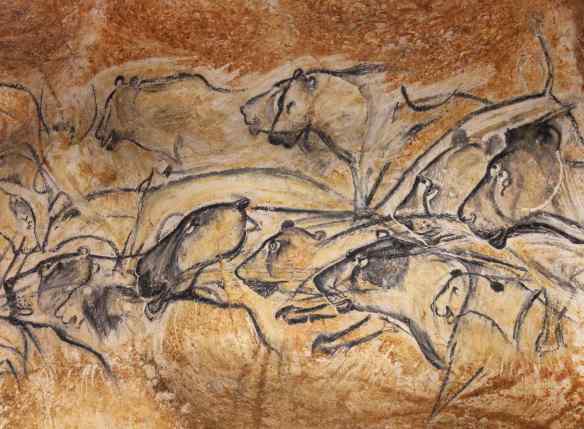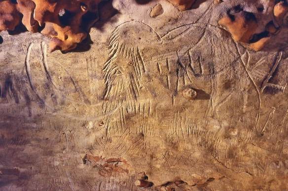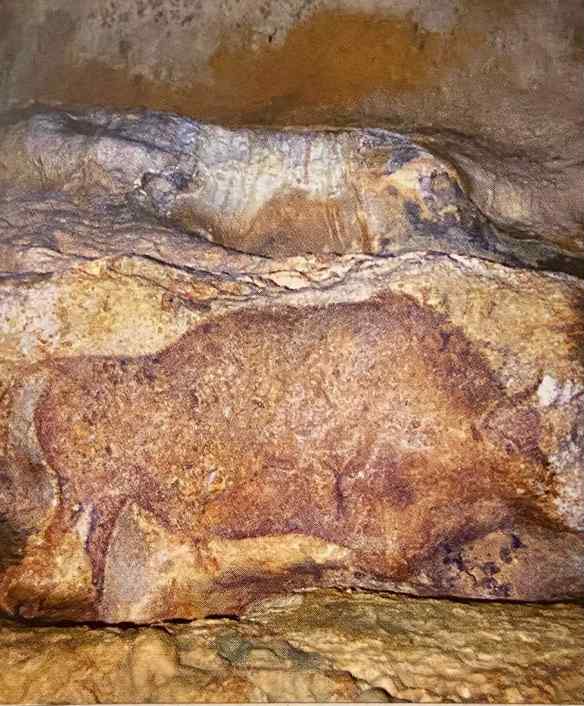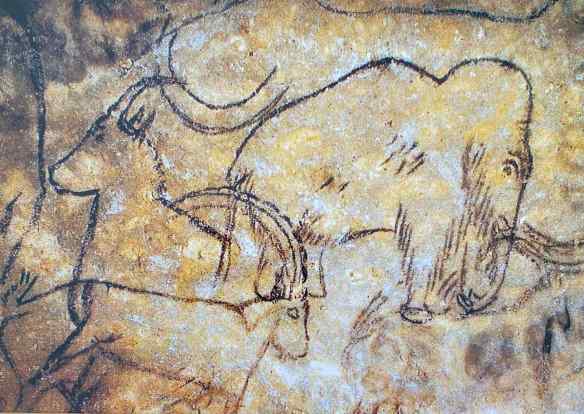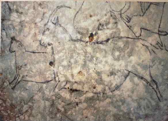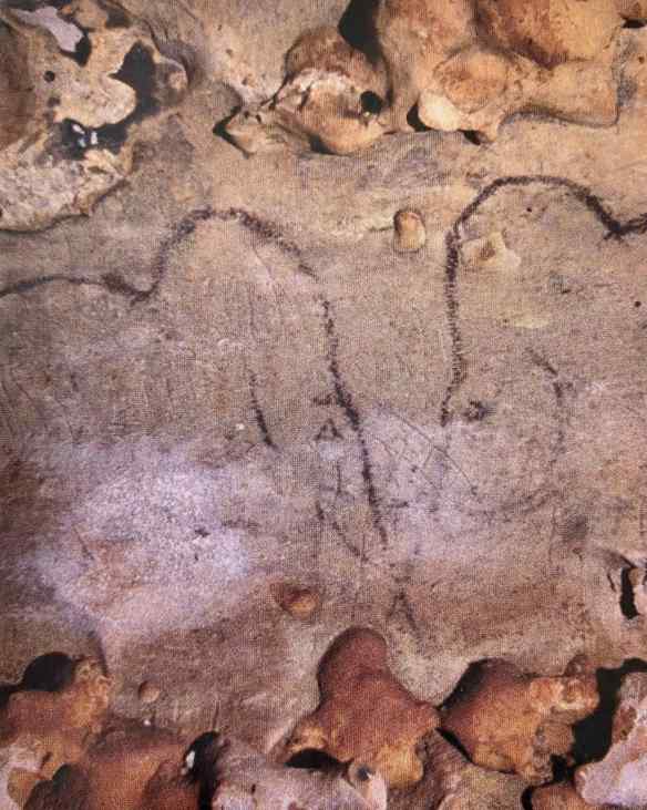 The first artworks we see are engravings…some of them were made by the artist using his fingers to mark the soft stone. Rouffignac is famous for its Mammoths. 158 mammoths that have been found on the walls of this cave, this is 30% of all mammoth representations in prehistoric cave art. Yet, curiously, there have been few mammoth bones found in this area. We also see cave bear claw marks all over the walls. The parallel vertical lines below this mammoth are from a cave bear scratching his claws on the cave walls.