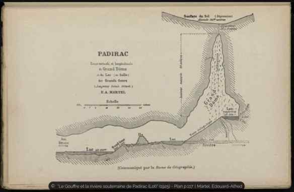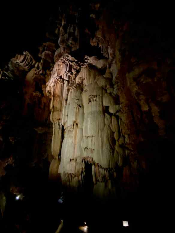 “A remarkable stalagmite lies above the lake. It is nicknamed the Pile d’Assiettes (Pile of Plates) because of its surprising resemblance to stacked-up china. It is a typical high-roof stalagmite formed when such a structure exceeds several tens of metres in height. Drops of water fall to the ground at great speed and explode, depositing limestone in circles and giving rise to very flattened formations.” ~